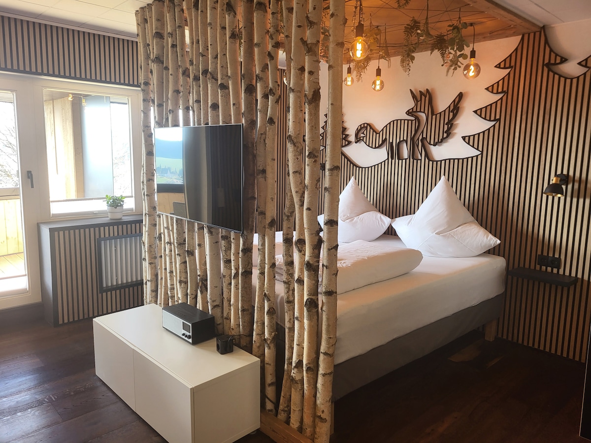 Auf 1000 Meter Höhe begrüßen wir dich mit einer atemberaubenden Sicht auf Schonach und den Schwarzwald. Entspanne in einem 2023 komplett renovierten Apartment mit topmoderner Ausstattung und viel Liebe zum Detail. Ob echter Baum im Wohnzimmer, Blumendecke über dem Bett, Fachwerkwände, Regendusche im Wald oder echtes Steinwaschbecken: Durch viele, hochwertige Details kommen Designliebhaber nicht zu kurz. Direkt am Waldrand gelegen ist der Fabelwald perfekt für Naturliebhaber.