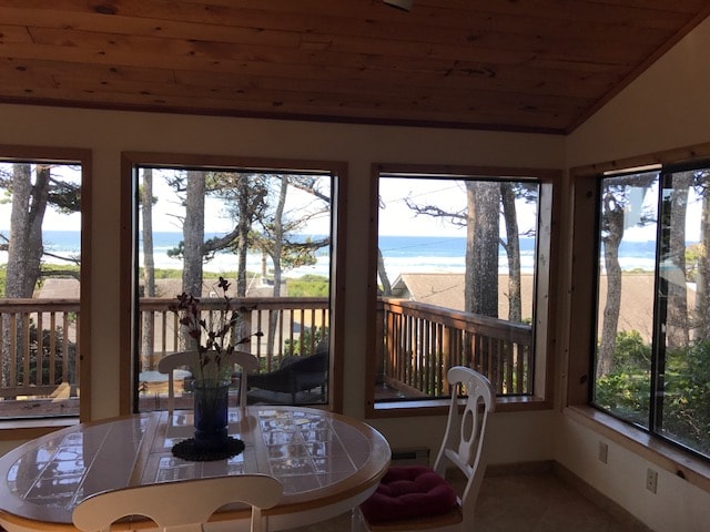 Tranquil ocean sounds! This one-of-a-kind A-frame sits on 8 miles of pristine beach. You can’t beat this oceanfront location! The charming cabin comes with a fully furnished kitchen and ocean view dining. The master bedroom is upstairs over the main room of the A-frame and has an ocean view and half bath. The main floor has a full bath, queen bed and a pull out Comfort Sleeper queen bed plus a cozy pellet stove. Relax on the large enclosed oceanfront deck and enjoy the amazing sunsets!