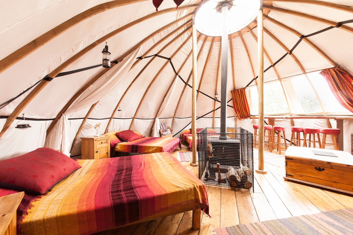 您一定會喜歡這個令人驚嘆的空間,坐落在草地腳下,提供隱私、僻靜和完全放鬆。 從四柱牀上仰望,白天觀賞雲朵,夜晚觀賞星空。 離網環保豪華露營更上一層樓。 您將擁有自己的廚房,配有炊具和爐具、生態廁所、熱水淋浴間和室外家具。 在寒冷的夜晚點燃原木燃燒器,舒適地坐在舒適的扶手椅上。 我們希望我們已經考慮到了一切,讓您擁有真正難忘的住宿體驗。