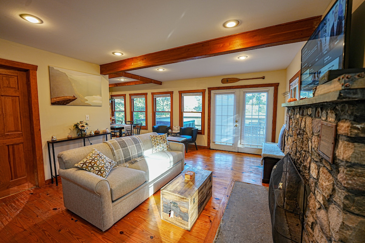 Intimate Lakefront country cottage on beautiful House Pond. Just 3 minutes from the Lake Wallenpaupack boat launch and 5 minutes from shopping, restaurants, bars, boat tours, fantastic hiking trails, and more. At this quiet, newly renovated (2022) retreat, you can experience great fishing, incredible sunrises and sunsets, bald eagles, blue herons, deer, various birds, and other wildlife. Relax and dine on the deck or lakeside flagstone patio while enjoying crackling embers in the fire pit.