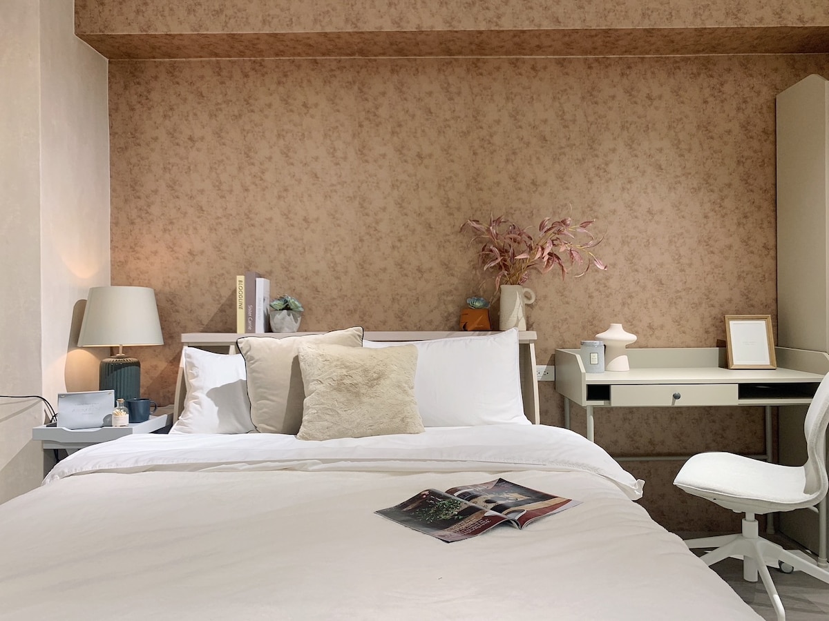 室內的灰白主色,配搭北美木紋銅色傢俱及家飾, 用心為您的居住空間提供沈靜優雅的感覺。日韓系電器的選用,不論是無線充電藍牙喇叭,大螢幕伸縮高清電視,都能滿足您對影音效果的要求。房源位於高樓內縮樓層,阻絕不必要的噪音並滿足您對景觀,安靜及隱私的要求。大樓並配有全天候警衛,住戶專屬電梯,公用大露台,以及地下收費停車場, 位處西門町核心路段,無論搭乘捷運或自駕都非常方便。Earth tone- based interior design offers warming, calm, healing and delighted atmosphere. Room facilities, including double bed, en- suite bathroom with shower enclosure, air conditioning, smart 4K TV with movies/Netflix, WIFI internet, cove lighting and music player with wireless connection & USB charger ports.