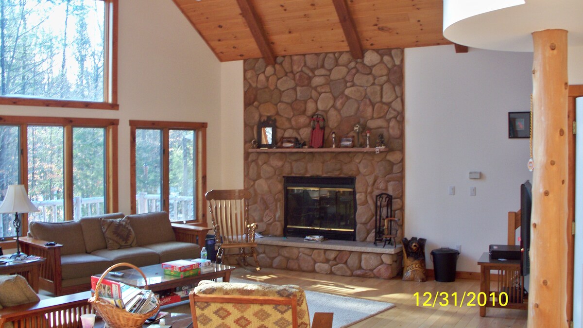 入住 Gore Mountain Chalet - 位於阿迪朗達克山的鄉村度假屋! 我們的舒適房源坐落在 10 英畝的私人土地上,可欣賞寧靜的池塘景觀,提供環繞式露臺、室內磚製壁爐、設備齊全的廚房和高速光纖網路。 享受Wi-Fi、Roku TV、炭火烤架、洗衣機/烘乾機和充足的停車位,距離北溪、滑雪、徒步旅行、鐵路自行車和漂流僅幾分鐘路程。