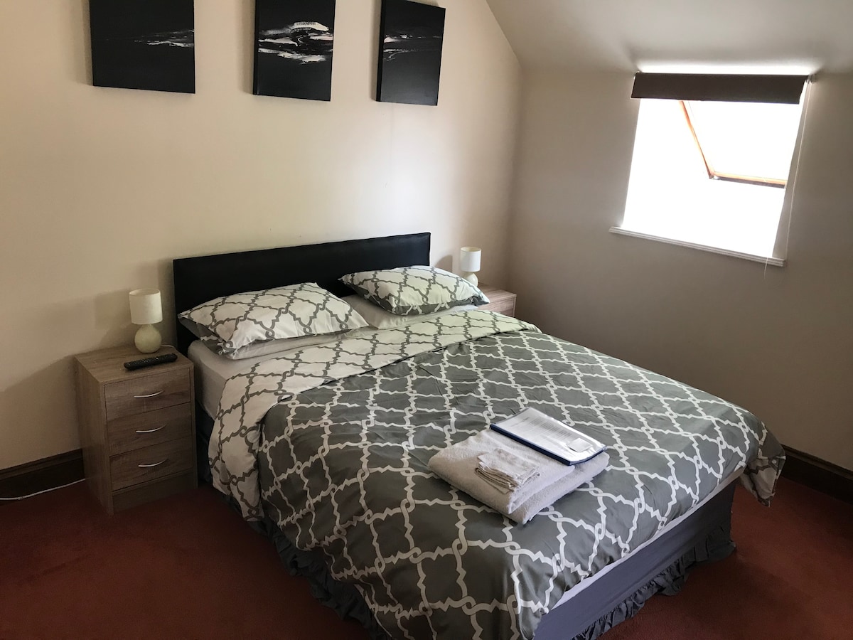 田園詩般的位置,可容納2位額外房客。 您自己的前門和停車位。 步行10分鐘即可抵達度假村世界、NEC、火車站。 A Greg 's、Costa、地鐵,步行5分鐘即可抵達房源。 這間寬敞的家庭房配有超級加大雙人床、額外的雙人沙發床(附加費 10 英鎊)、現代化的套房浴室和大衣櫃,配有更衣室。 提供熨衣板/熨斗、吹風機和茶/咖啡設施,以及您自己的冰箱和微波爐。