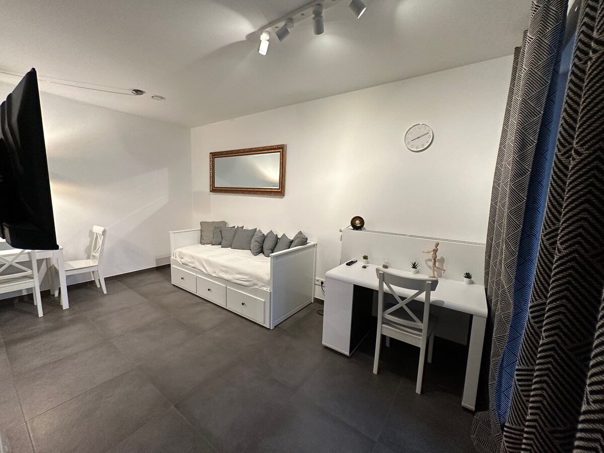 這套安靜、整潔、明亮的公寓(28 平方公尺)位於特里爾-魯威爾高地,位於一棟 5 層樓房屋的地下室(下 1 樓),可俯瞰綠地。 入口處有一個小廚房。從這裡可以直接進入帶淋浴/馬桶的浴室。左側 - 獨立於廚房區域 - 是寬敞的客廳/臥室。 配有舒適的休息區、智慧電視和Wi-Fi,您可以在這裡放鬆身心,親近大自然。