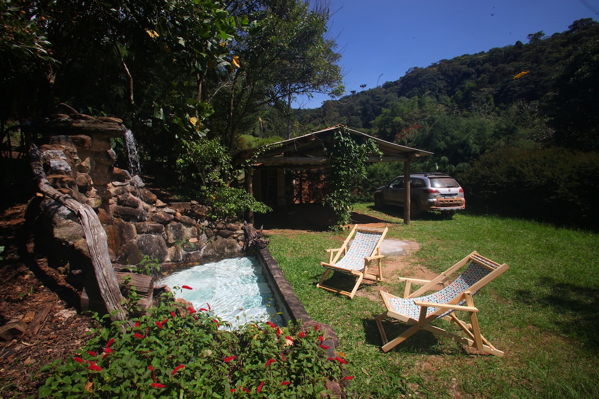 Refuge das Juçaras是一座典型的森林房屋,鄉村、乾淨、舒適,四周環繞著巨大的石頭,使地形迷人。 這棟房子位於環境保護區內,融入自然中,包括棕櫚樹、蕨類植物和大西洋森林的其他美景。 在土地的底部,穿過結晶的阿蘭巴裏河( Alambari River ) ,將我們的土地與伊塔蒂亞國家公園( Itatiaia National Park )隔開。 房子位於一個靠近Serrinha翡翠井的地區。 這是一個迷人的地方!