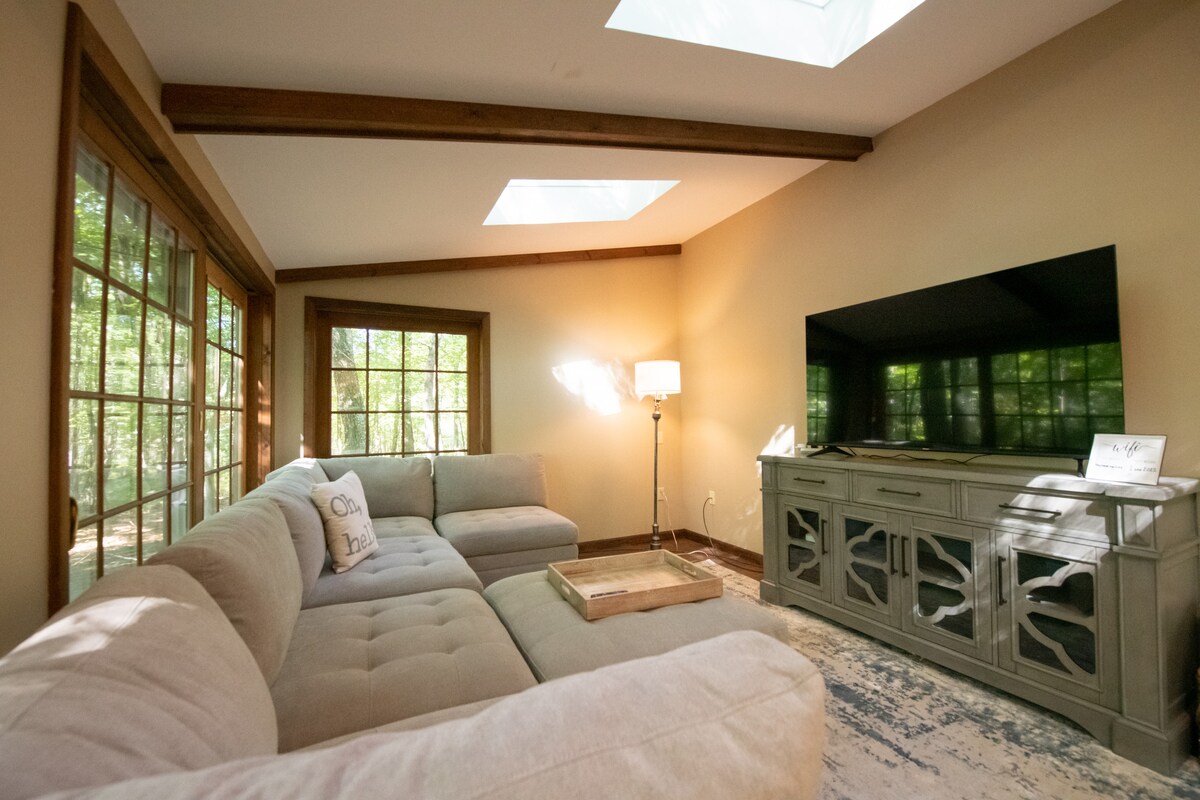 距離GW橋約兩小時-這座美麗的鄉村房源就位在特拉華河上。 房子設有全套廚房、大餐廳和兩個俯瞰河流的門廊。觀賞老鷹、在壁爐旁取暖、滑雪、遠足、釣魚、獨木舟、游泳、吃飯和懶洋洋地休息。這間房源配有高速有線電視和WiFi ,室內外空間寬敞,非常適合度假、宅度假或適合遠距工作的家庭和情侶。