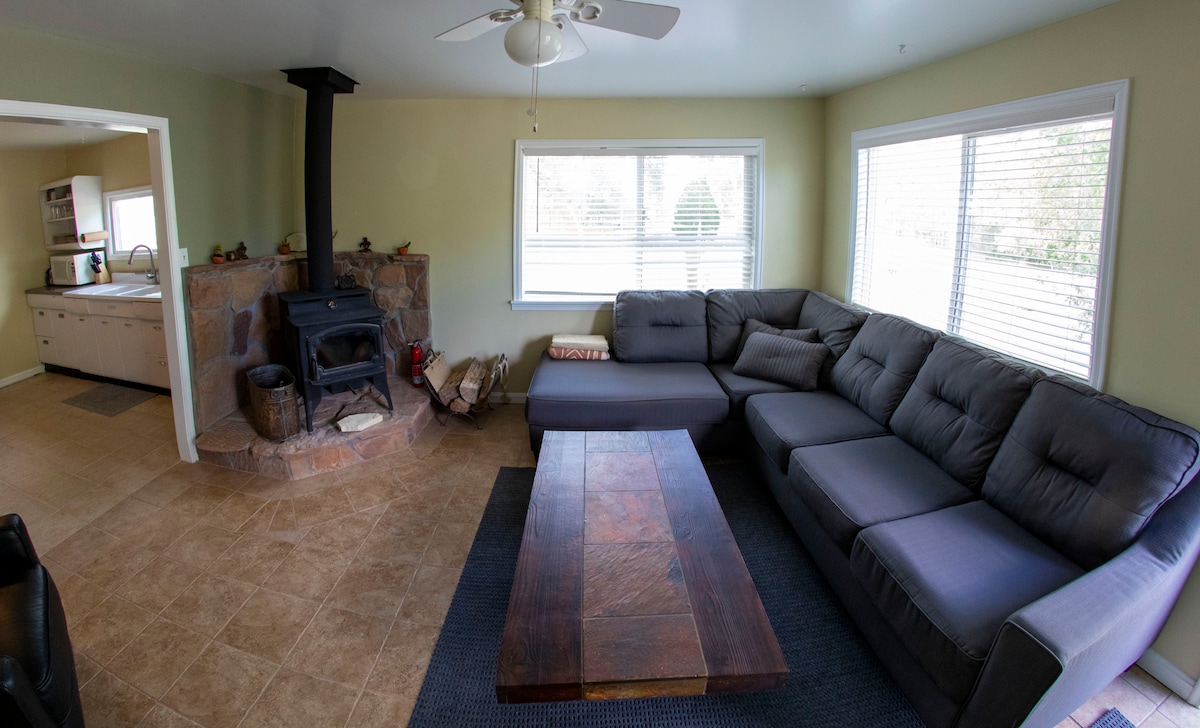 Inviting two bedroom bungalow with unique, private, and spacious outdoor space. New, comfortable beds, wood burning stove, artisan hand-made furniture. New heating and AC system. Two dedicated work spaces and 1G fiber internet for remote work! The most shade and privacy you'll find in town. Help yourself to the fruit trees, enjoy the stars and mural of Factory Butte from a hammock, fire up the grill for some patio dining and take a selfie in the #DirtyDevilSaloon