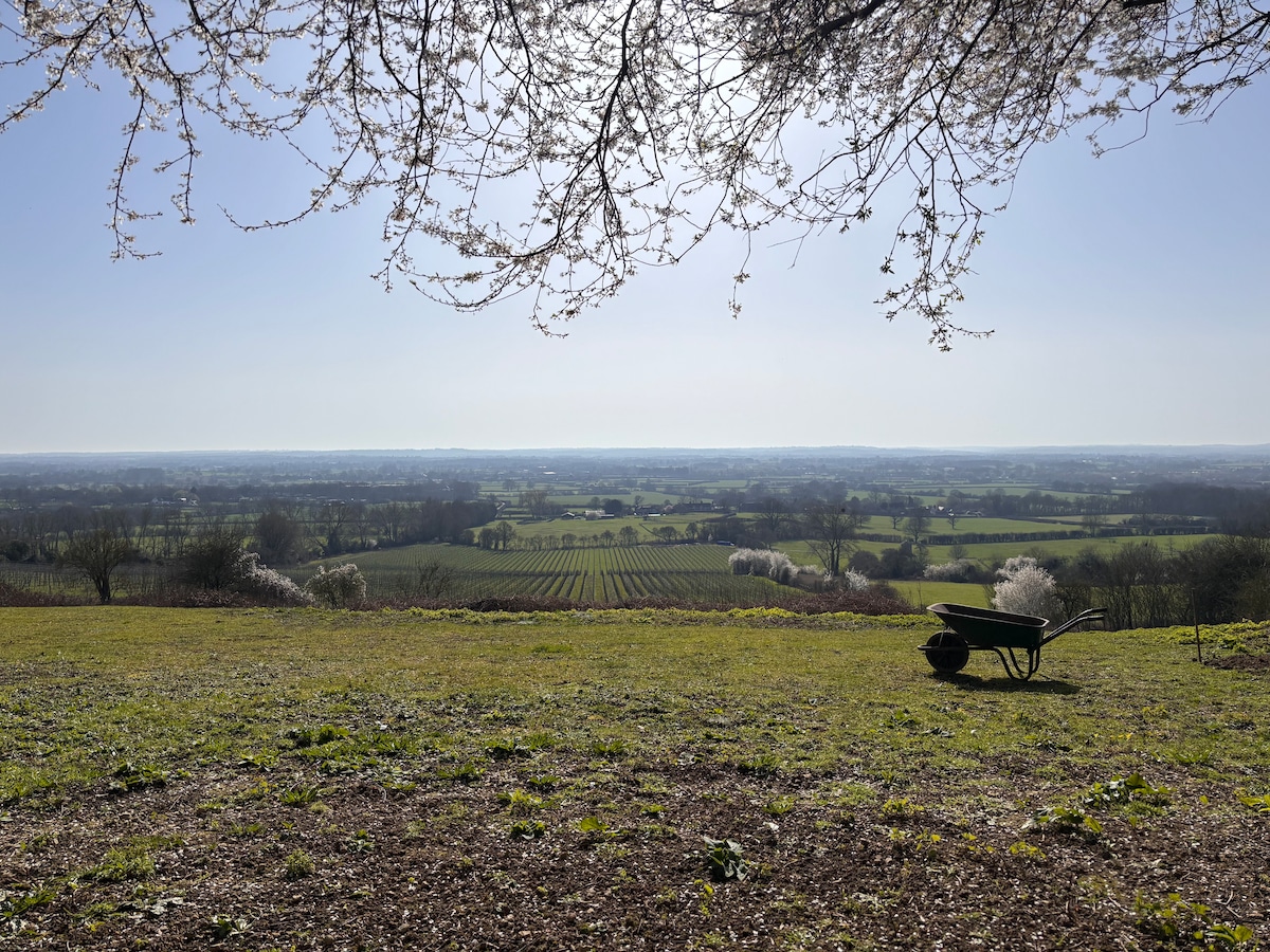 享受這個大自然中寧靜景點的可愛環境。 我們的全新豪華露營帆布帳篷配有舒適的雙人床、拉出式沙發床和單人日式床墊,最多可供5人入住。 帳篷位於我們果園的蔬菜田旁邊,但周圍有充足的空間和田野。 我們直接位於通往Vanguard Way的步道上,所以從門口步行很方便。 為雙人床提供一套床單。 若人數較多,請自行攜帶床上用品和床單。 Xtra按成本提供。