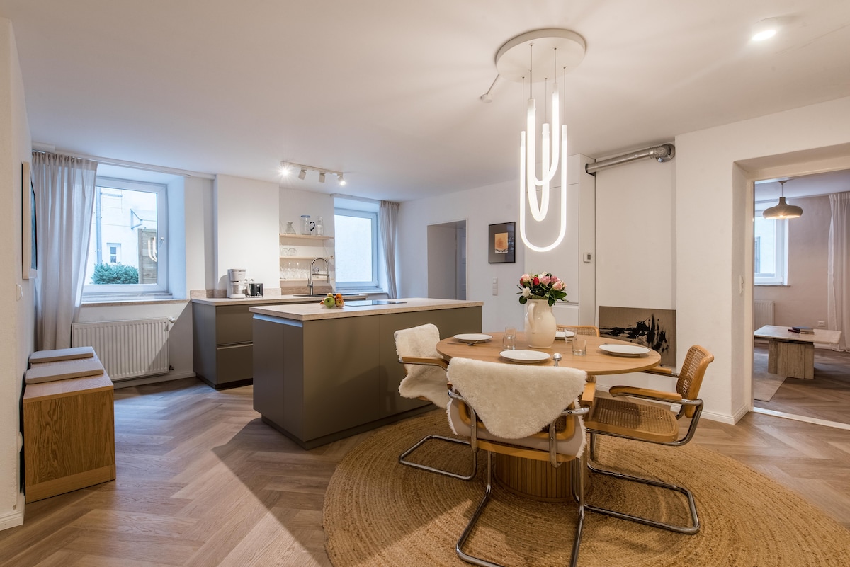 在奧格斯堡市中心享受時尚的生活體驗。 這間現代化的新翻修公寓結合了設計、舒適和高品質的家具。 優雅的廚房配有廚房島和頂級電器,讓您享受共享時光。 現代化的餐桌、漂亮的床、舒適的沙發床和時尚翻新的浴室,確保您住得舒適。 非常適合情侶、小家庭、朋友或商務差旅人士。