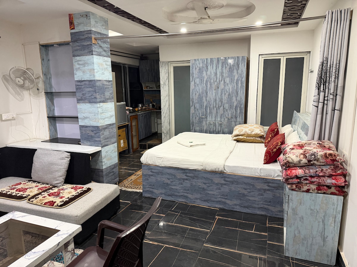 Spacious and comfortable room at Prince Lodge featuring a private kitchen, a modern bathroom with a relaxing bathtub, and a balcony for fresh air. The space includes a cozy bed, a living area with sofas, TV, and a table, perfect for both short and extended stays. Ideal for couples or travelers seeking comfort, privacy, and convenience in Siliguri.