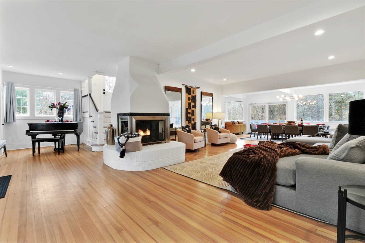 Awaken to an idyllic lake view through a timber-framed glass facade. Acclaimed social realist painter Reginald Marsh's family estate is known to be unique for Woodstock with its ball shaped junipers, a pond that brackets the house, expansive lawns, a gathering of birches and 100 year old cone shaped cedar trees. In short walking distance to the center of Woodstock the secluded setting with a private waterfall bordering a public preserve as well as the attention to architectural detail is unique.