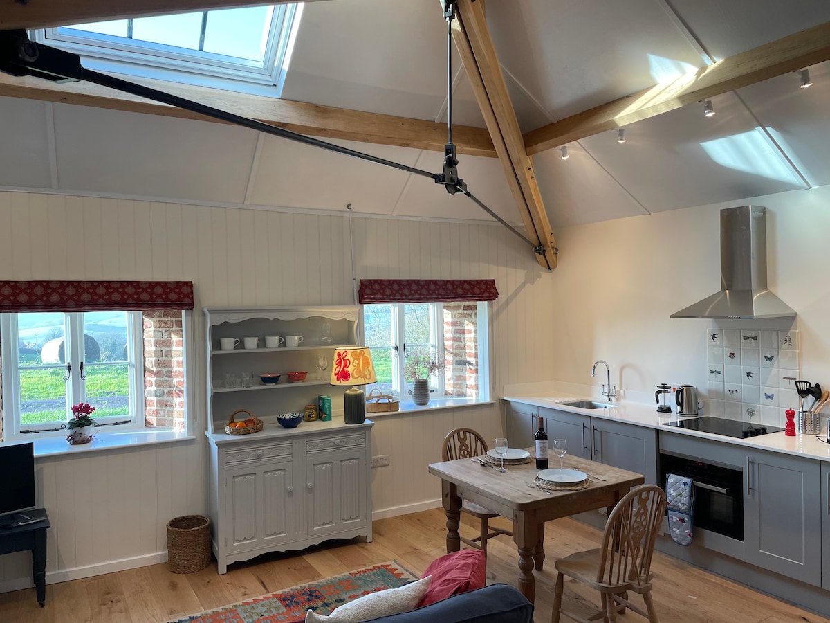 A rural bolthole in a converted barn - comfort and style with just a nod to luxury. Part of a small cluster of outbuildings behind our home, surrounded by 14 acres of fields. Designed for year round use with lovely outside spaces for summer and a cosy interior and wood-burning stove for colder months. Totally self-contained, secluded, and away from the coastal crowds, but just 10 mins Bridport & beach. Attention to every detail to give you everything you want, but nothing you don't need.