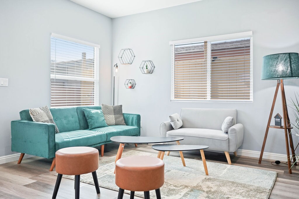 在我們時尚、乾淨、現代化家具的房源享受輕鬆的假期住宿。這個可愛的小屋包括一個設備齊全的廚房,配有27立方英尺的4門冰箱、配備蒸汽技術的全新前置洗衣機和烘乾機、免費高速WIFI、兩臺配有Netflix的55吋Vizio 4k電視、專屬工作區域,可滿足您的所有短期和長期需求。