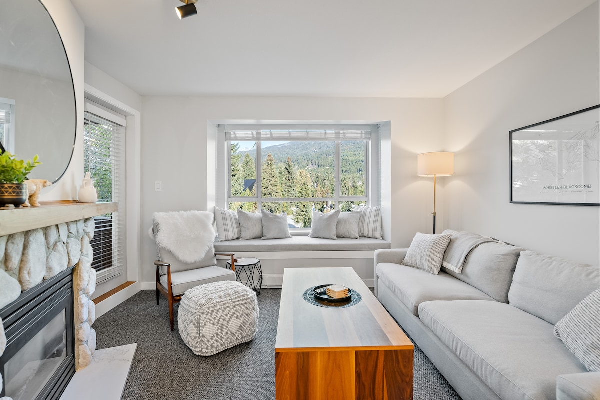 歡迎來到您的山間綠洲。 步行 1 分鐘即可抵達黑梳滑雪纜車! 我們的現代公寓是明亮、寬敞的 1 間臥室,窗戶環繞,可欣賞完美的樹木和山景。 在廚房桌子上喝咖啡時,抬頭就能看到惠斯勒山! 套房配備了所有設施: -加大雙人牀 -沙發牀 -全廚房 -按摩浴缸 - Keurig Bose喇叭 -中央空調- 2025年7月升級 大樓有健身房、洗衣房、泳池和室外熱水浴缸。