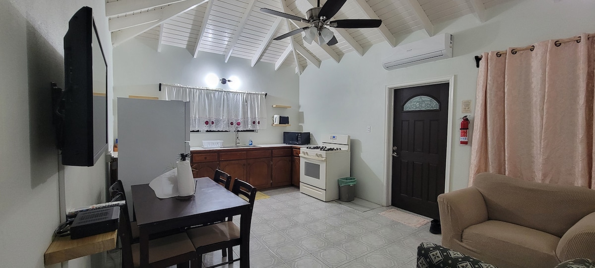 Enjoy a one bedroom, one and a half bath house with full kitchen, living room, and wrap around Verandah with gorgeous views of the ocean and Nevis Peak. This house is located on a quiet street within walking distance of the main road with available local transportation. House has all the amenities you need and maid service is available