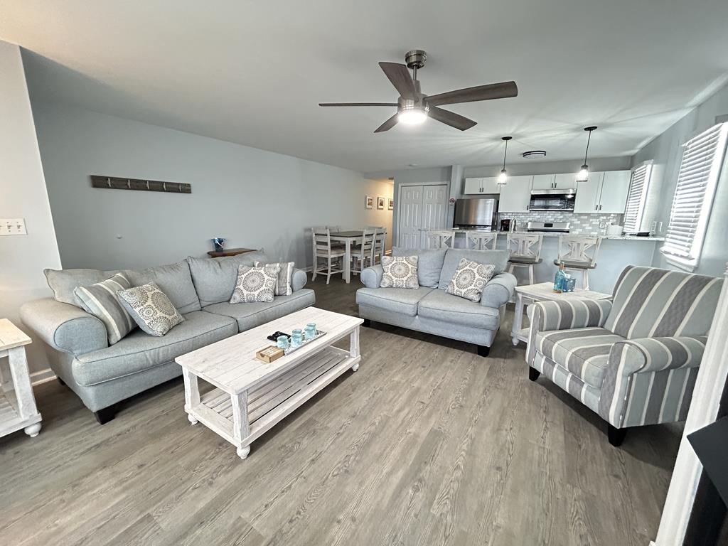 現代3床/2浴室公寓,配有環繞式露臺和戶外座椅。客廳有很多座位,可通往大廚房。主臥室有全尺寸床和單人床以及私人全套浴室,臥室2 :全尺寸床,臥室3 : 2張全尺寸雙層床,頂部有單人床,廚房備有(無鹽、胡椒、油)、全套浴室、床單、空調/暖氣、2個停車位。距離海灘/會議中心2個街區。出租給25歲以上的承租人,禁止舉辦派對/活動。不包括毛巾