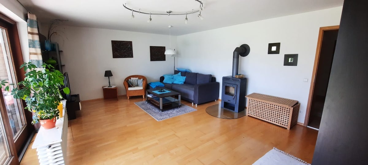 Moderne, großzügige Ferienwohnung m. 103m2. 3 Schlafzimmer, Platz für 5 Personen, 1 Bad (1 x Dusche, 1 x Wanne), große Küche mit Massivholztisch. Vollausstattung: kostenfreies WLAN, 65" LED Fernseher, SMART HOME fähig, Schwedenofen, vollausgestatte Küche, Kaffeemaschine, Bettwäsche, Handtücher, Balkon, etc. . Schlüssel für Selbst-check-in möglich. Achtung die Wohnung befindet sich im ersten Stock. Ideal für Geschäftsreisende (Home-Office), Monteure, Kurztrips, Freunde oder Familienaufenthalte"