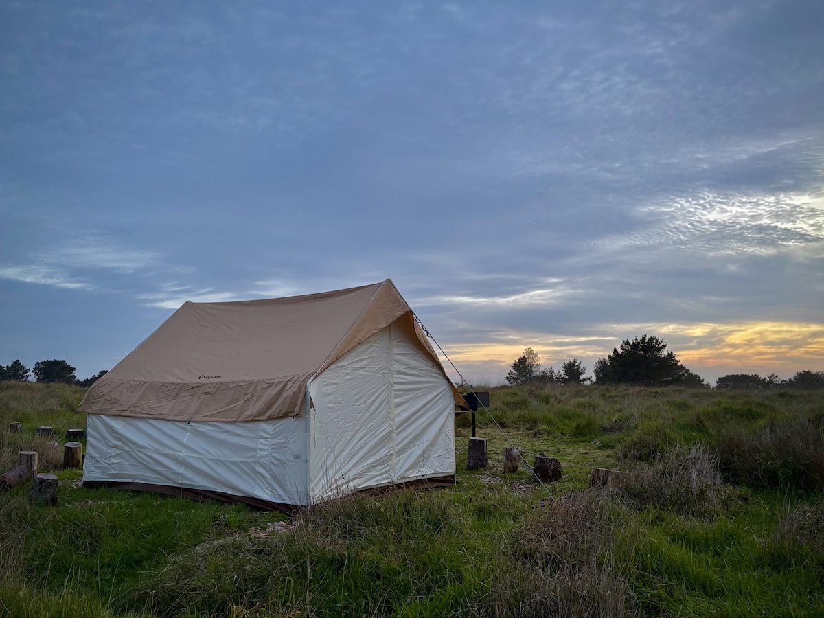 Looking for a few days of seclusion and peace in nature? Our gabled tent and two cots are simple and basic, but you'll be surrounded by pines, grasses, and occasionally deer. Walk to the Pacific headlands at dawn or sunset--no roads, no buildings, nothing but the sounds and sights of the seals barking and the waves crashing. Visit Point Cabrillo Lighthouse, picnic or swim at Frolic Cove beach...both an easy walk down our wide trails! Bathroom with hot shower and laundry included onsite.