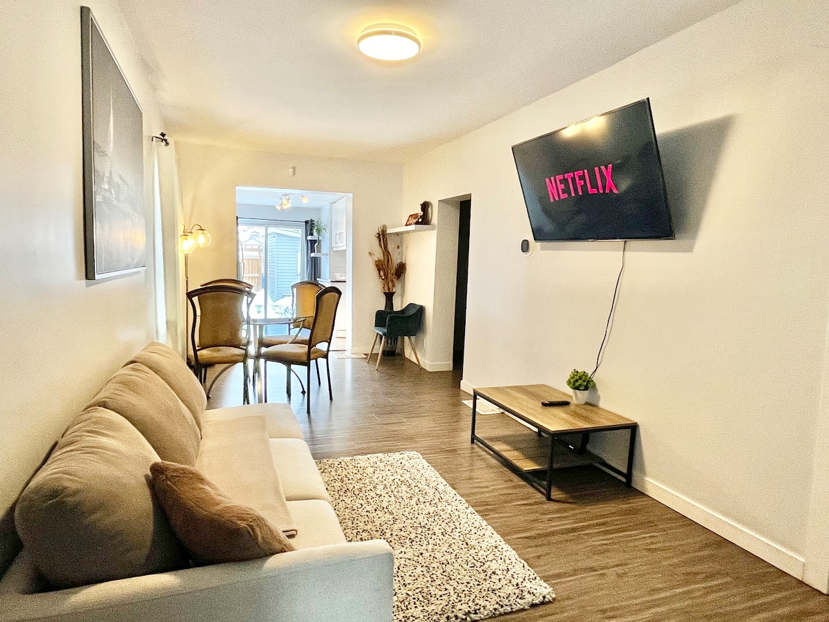 1150平方英尺的空間。 -床很棒! ! -家具齊全 -開放概念 -所有設施 很安靜 -在一個非常好的街區 -前後入口,保護隱私 -靠近所有地點和機場 全套WiFi -2個消防方塊(無限頻道和電影 - 存取所有串流應用程式 -主臥室非常寬敞,配有您自己的個人壁掛衣櫃,讓您感覺像在家裡一樣。 -停車位就在通往樓上的門後面