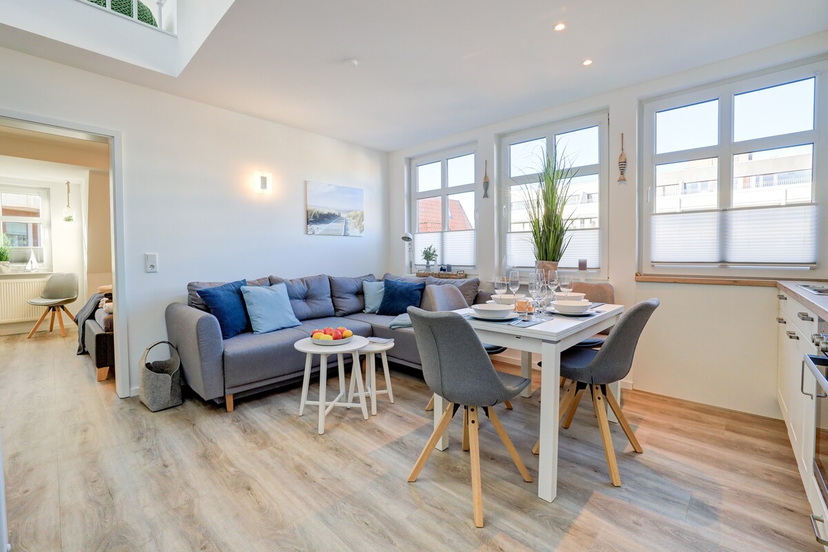 明亮的北歐風格單臥室公寓,位於二樓,配有真正的木鑲木地板、設備齊全的廚房、浴室,以及朝南的陽臺,配有沙灘椅。 位於Wenningstedt市中心,靠近村莊池塘、許多商店(樓下的麵包店、附近的美食)和很棒的餐廳。 Gosch和海灘都在附近(5-10分鐘)!巴士站就在前門外。 入住時間為下午 4 點,退房時間為上午 10 點