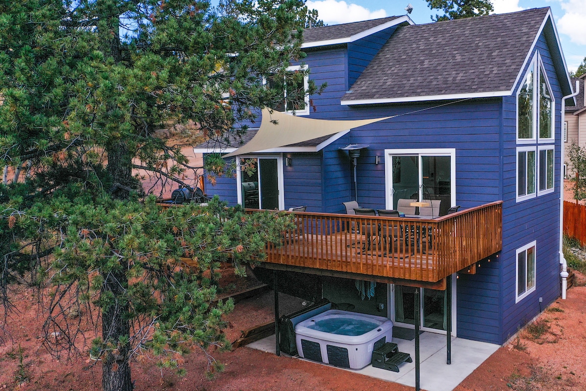 逃往「藍雲杉度假木屋」。 900平方英尺 A型屋(ish!)度假屋位於Manitou Experimental Forest的2英畝私人土地上,距離Woodland Park以北15分鐘,距離世界級步道和釣魚地點僅幾步之遙。 探索戶外活動或計劃入住。 享受設備齊全的廚房、燃木爐、室外火爐、2個露臺,可欣賞壯麗的山景和日落景觀,以及可靠的快速WiFi。 從按摩浴池眺望星空。 您可能永遠不想離開這片天堂。 非常適合短暫的度假。