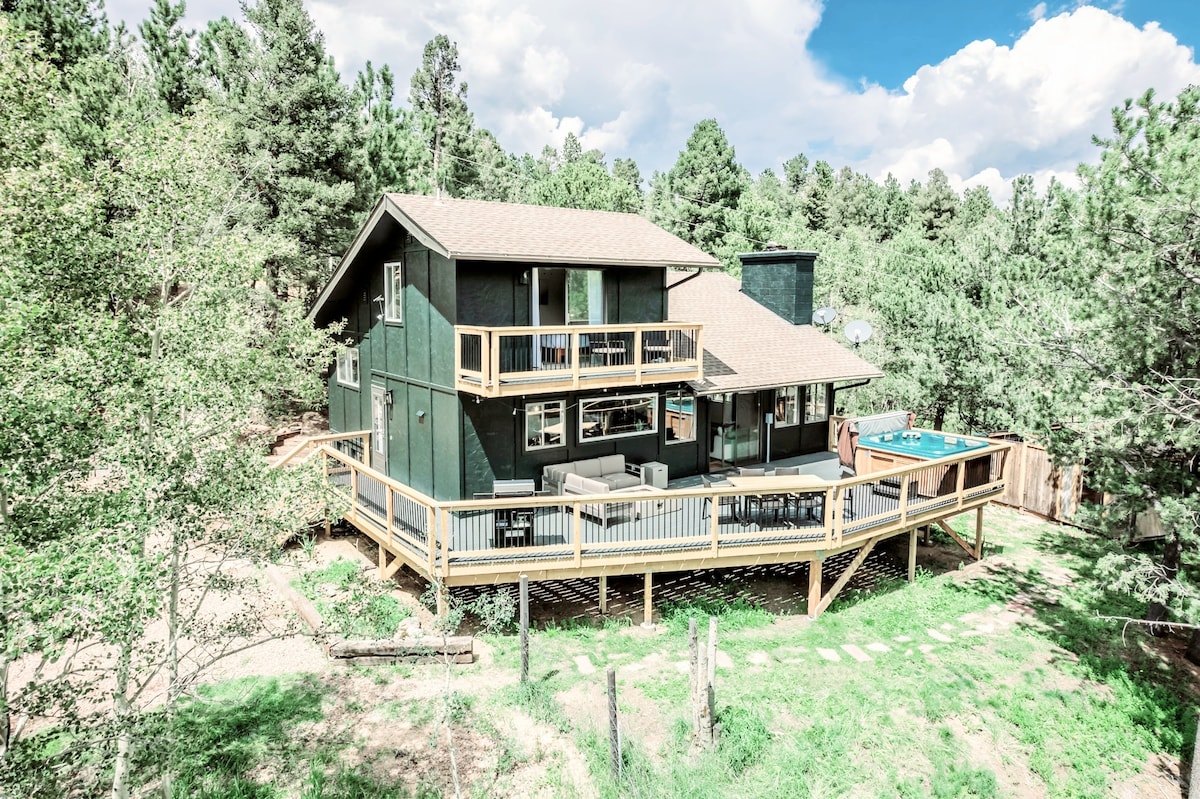 山鎮度假和庇護所! 在派克國家森林( Pike National Forest ) ,從房源步行即可抵達非常適合的徒步/跑步小徑。 短途車程內有露營、釣魚、野餐和徒步道。 老城林地公園( Woodland Park )有家庭娛樂和餐廳。 短途車程包括Manitou Springs、Santa's Workshop、Cave of the Winds、Garden of the Gods和Pike's Peak ! 配有兩個燃木壁爐和大型家庭房,讓您感到舒適。 配備私人按摩浴池、火坑、烤架和餐桌的戶外露臺