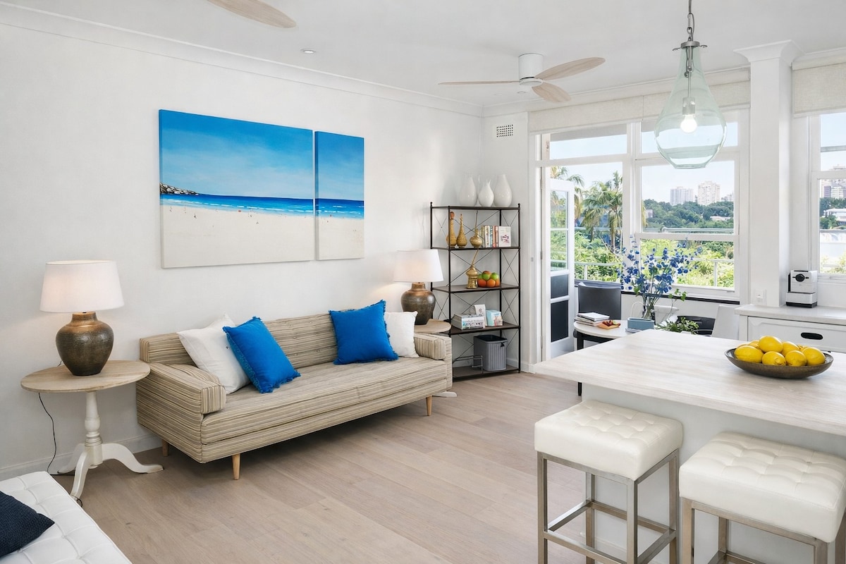 這是全新翻修的設計師公寓,位於頂樓,朝向東北方,坐落在樹頂之間,地平線上可看到海景。 安靜且私密的位置,提供免費街頭停車位,步行10分鐘即可抵達海灘。 享受查令十字路口(Charing Cross)的精品店、咖啡廳、餐廳、酒吧和公共交通。步行20分鐘即可抵達邦迪交叉口Westfield和火車站。附近街道有巴士。 *不適合兒童和嬰幼兒入住。