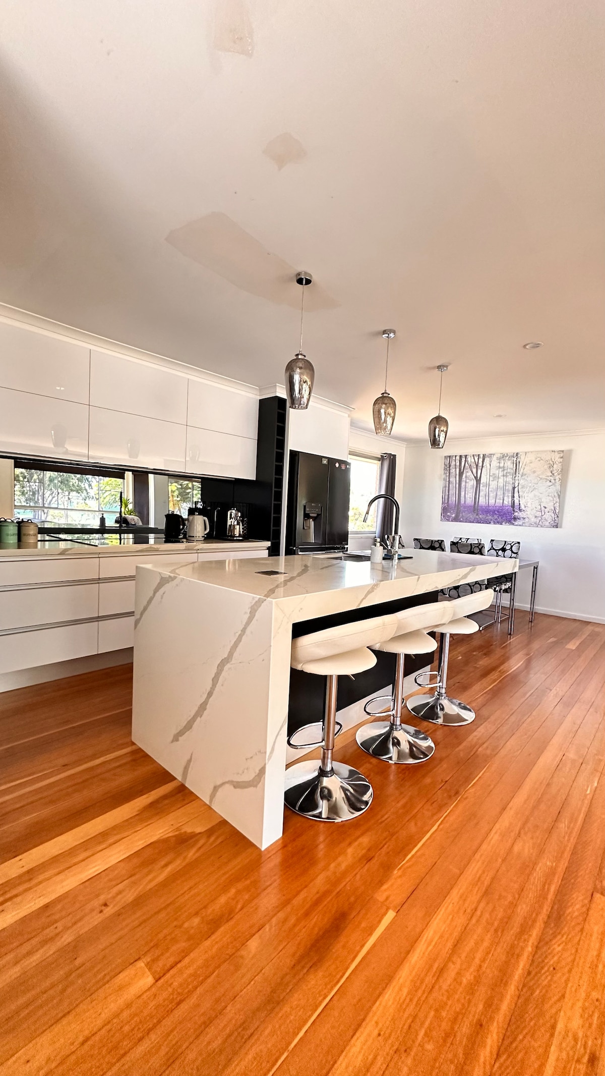 Beautiful Waterfront home. Modern interior. Rare water front, Direct water views, beautiful sunsets. Relax on the pergola with a wine & watch the world go bye. Glass house mountains views. Spacious open plan. Wifi. Fully Ducted air conditioning aircon bedrooms (2 up stairs, 2 on ground floor. All with Water views. 2nd lounge on the ground floor. Plenty of room for a large family. Great location, walking & bike tracks along the water. Secure parking for a boat+ pets. & two drive ways