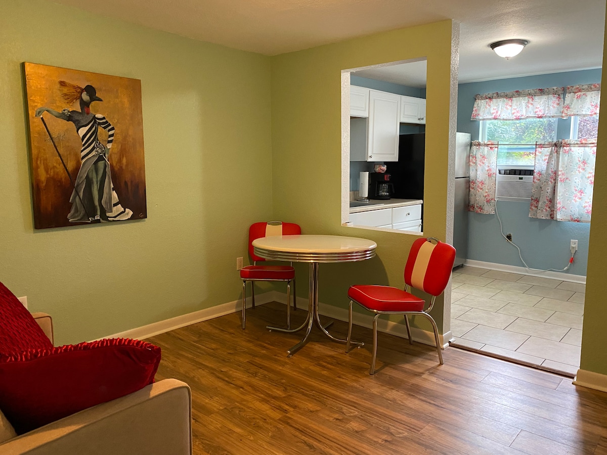 This cute one-bedroom bungalow is fully self-contained. Though it is attached to the main house, it has its own private entrance and porch, complete kitchen, and full-size washer/dryer. It is conveniently located in a quiet, southside neighborhood: less than a mile from Lake Mayer park, about 10 minutes from Sandfly & Skidaway, 15 minutes from downtown and River Street, and only 30 minutes to Tybee beaches. There is covered parking at the back and a beautiful live oak tree in the front.