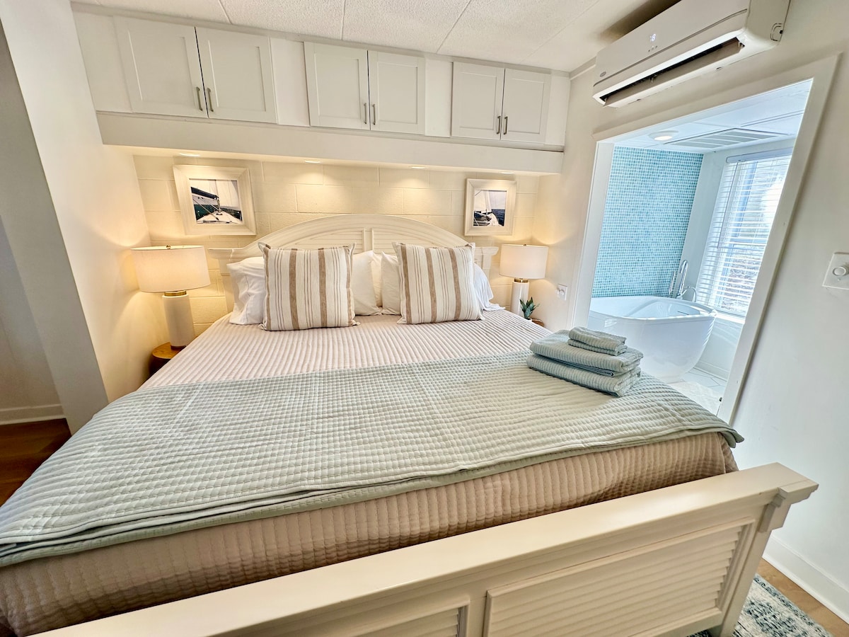 在這個全新翻修的獨特公寓坐落在沿海水道旁,感覺像當地人一樣。 無需搜尋停車位! 步行即可抵達許多熱門餐廳;漫步穿過橋樑,然後步行即可抵達。 騎自行車只需6分鐘即可抵達海灘。 Salty Pelican明亮乾淨,配有奢華的牀單。 入住幾晚或幾週,您可以入住海灘/商務差旅。