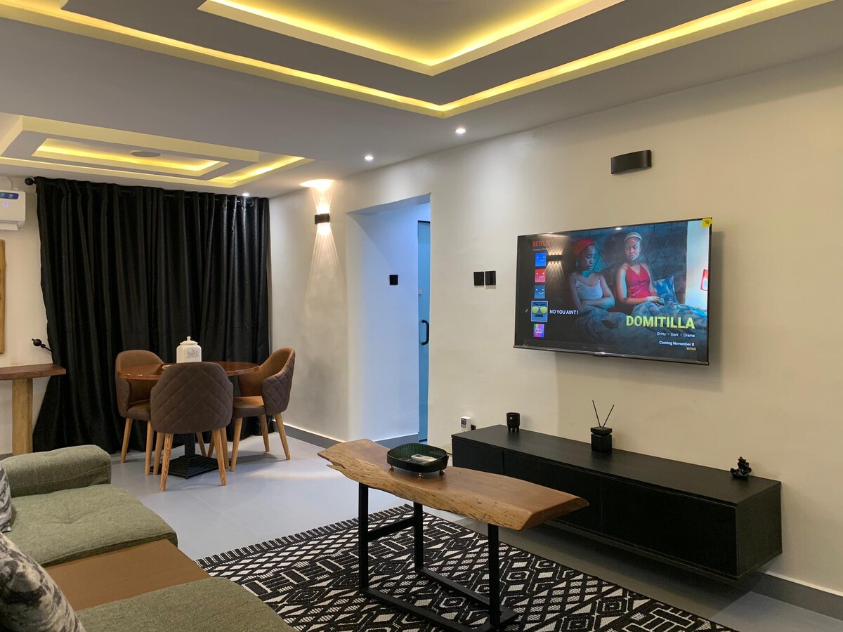 Door with Code Private Balconies Washing Machine Cozy 3 Bedrooms 5 Air-Conditioners Dedicated Workspace Furnished Living Room Fully Equipped Kitchen 4 Toilets and 3 Bathroom Starlink & Fibre Optic Wi-Fi 24/7 Light (Solar | Inverter | Gen) If No Power Grid: Gen: 6am-8am,6pm-12am but inverter always on. Proximity to Markets, Night Clubs, Restaurants and Stores Clean and Fresh Bedding and Towels Serene, Secure, and Beautiful Neighborhood 85”, 65", 50", 50" Smart TV (Prime, Netflix)