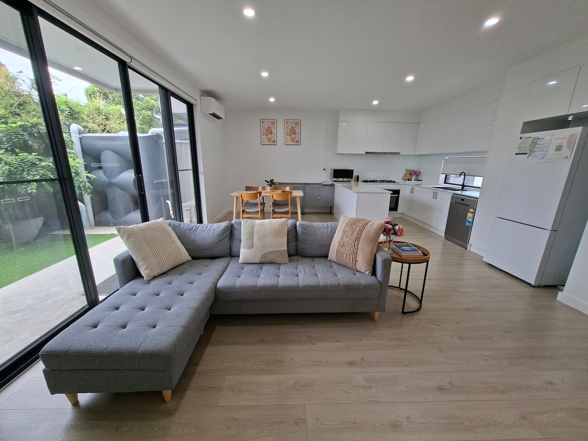 您將獨享整套明亮的兩房房源。步行6分鐘即可抵達Altona火車站,步行4分鐘即可抵達海灘,街尾有櫻桃湖。搭乘火車30分鐘即可抵達墨爾本CBD。房子提供許多隱私和路邊停車位。Foxtel 電影讓您娛樂。極佳的中央暖氣和冷氣。適合狗入住。 請勿舉辦派對,否則我們將要求您離開。