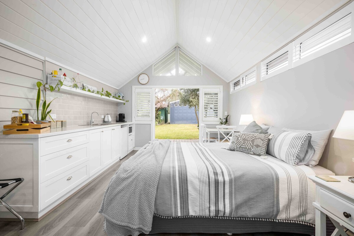 The studio, 300m from town and the beach, is attached to the main house but is completely private with your own entrance and courtyard. The Studio has 1 queen bedroom, 1 ensuite bathroom, 1 kitchenette and 1 lounge room/consulting space. There is reverse cycle air conditioning, WIFI and TV. The private courtyard, with its own outdoor setting is perfect to store bikes and surfboards. There is shady off street parking and the front door key is accessed from a lock box at the studio entrance.