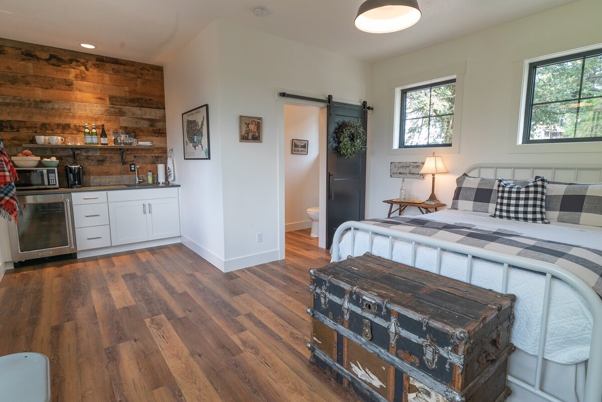 Escape to Oregon Wine Country! Light and bright modern farmhouse style rental . Enjoy a private suite in a detached barn with views of a country setting. King size bed with large Master suite and private patio. Queen size bed in a beautiful 2nd bedroom. Rental has a separate entrance in its own building. A 1800sf family/ rec room. Cozy fireplace, full kitchen, washer and dryer. Outdoor dining table on the patio. Located just one mile from Stoller Family & many more. Owners on site to assist