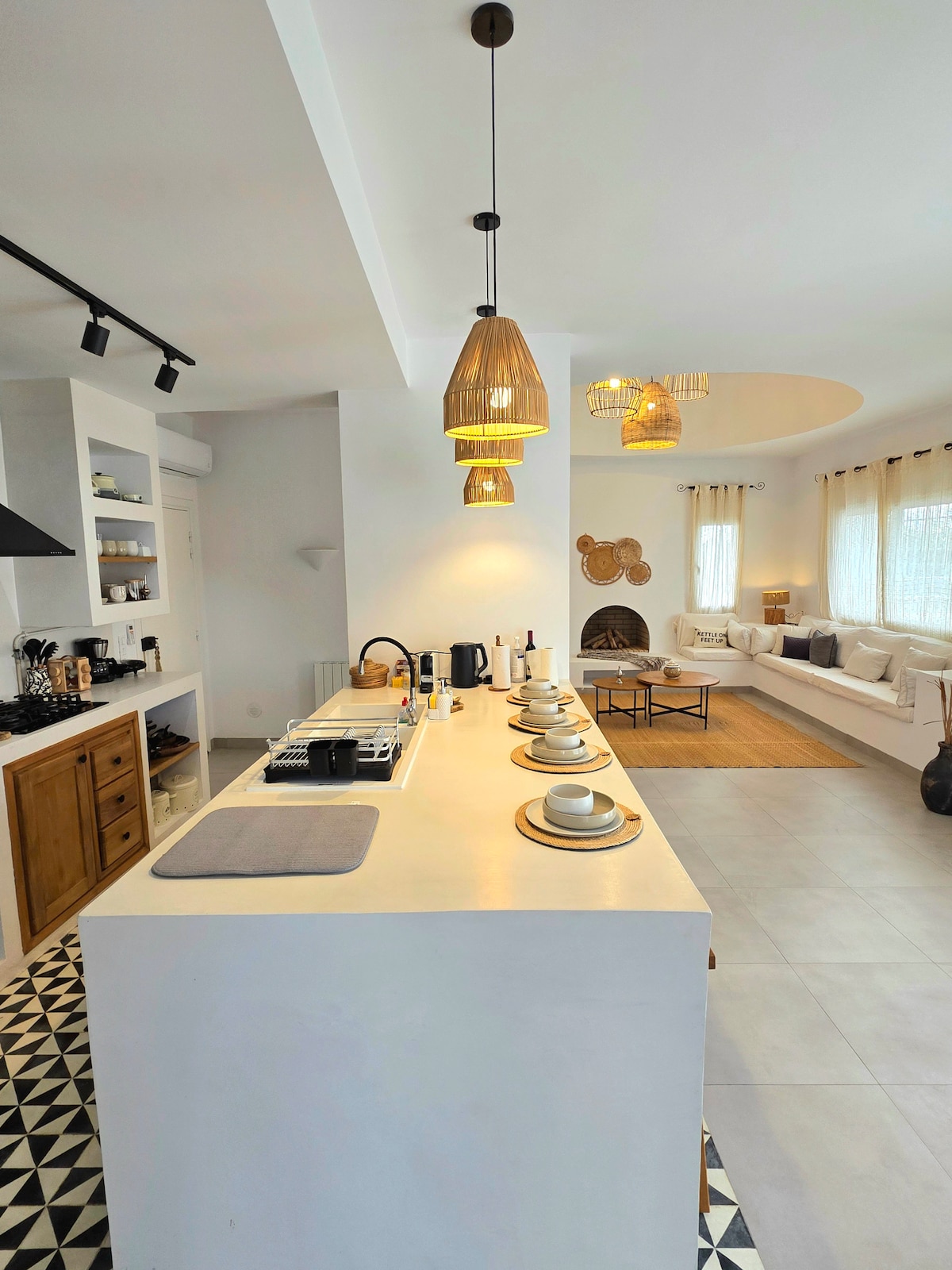 Cette maison de style méditerranéen à 500 mètres de la plage de Mrezga à Hammamet offre tout le confort moderne avec deux chambres, un salon avec cheminée, une cuisine équipée, une grande terrasse avec chaises longues . Décorée dans des couleurs apaisantes, elle est idéale pour des vacances en famille ou entre amis. Réservez dès maintenant pour des vacances inoubliables