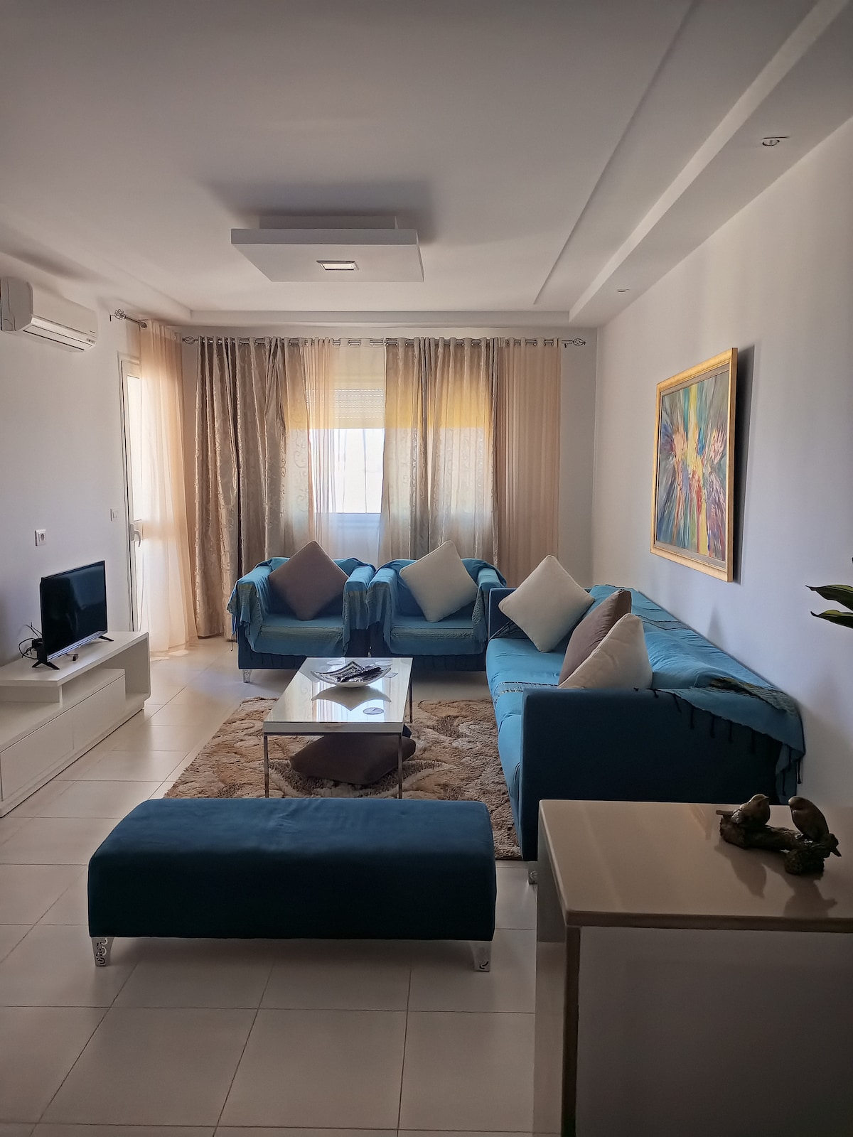 Profitez en famille de ce fabuleux logement à Hammamet nord S+2 haut standing meublé,4ème étage avec ascenseur bien équipé sécurisé.Son emplacement est superbe entre le centre ville de Hammamet et de la belle ville de Nabeul, 500m de la plage, à 700m de la zone touristique Hammamet nord, à proximité de l'hôtel Azur Plaza et à 45mn de l'aéroport de Tunis Carthage et l'aéroport de Nfidha. Vous trouverez tout genre de moyen de transport(taxi privé ou collectif, bus, train). Soyez les bienvenus.