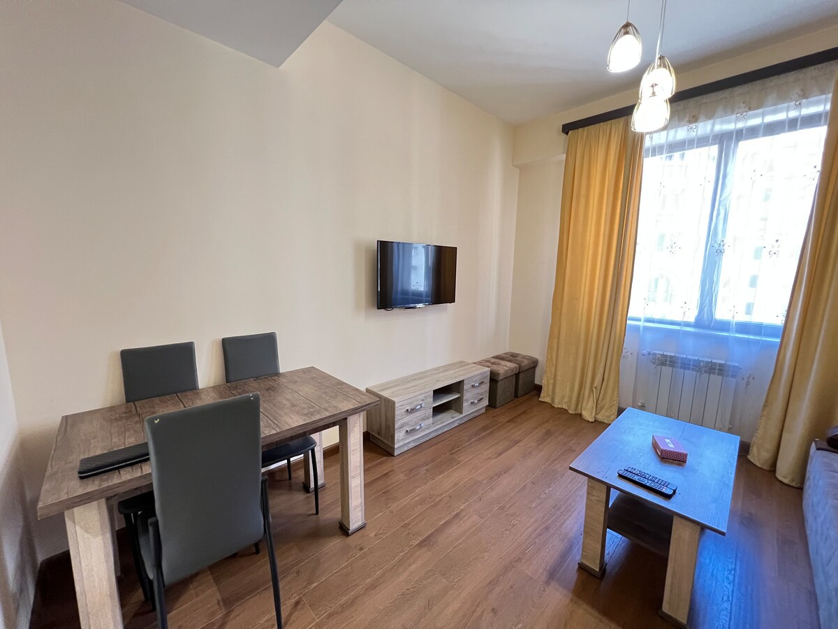 享受位於葉里溫市中心Tumanyan和Nalbandyan十字路口的明亮寬敞的2間臥室公寓。 房源設有設備齊全的廚房、全套衛浴和舒適的客廳,配有沙發、用餐區和電視。 在俯瞰城市的陽台上喝咖啡。 配備快速 Wi-Fi、專屬工作空間和電梯,非常適合家庭和商務旅客。 距離咖啡廳、商店和共和廣場等主要景點僅幾步之遙。