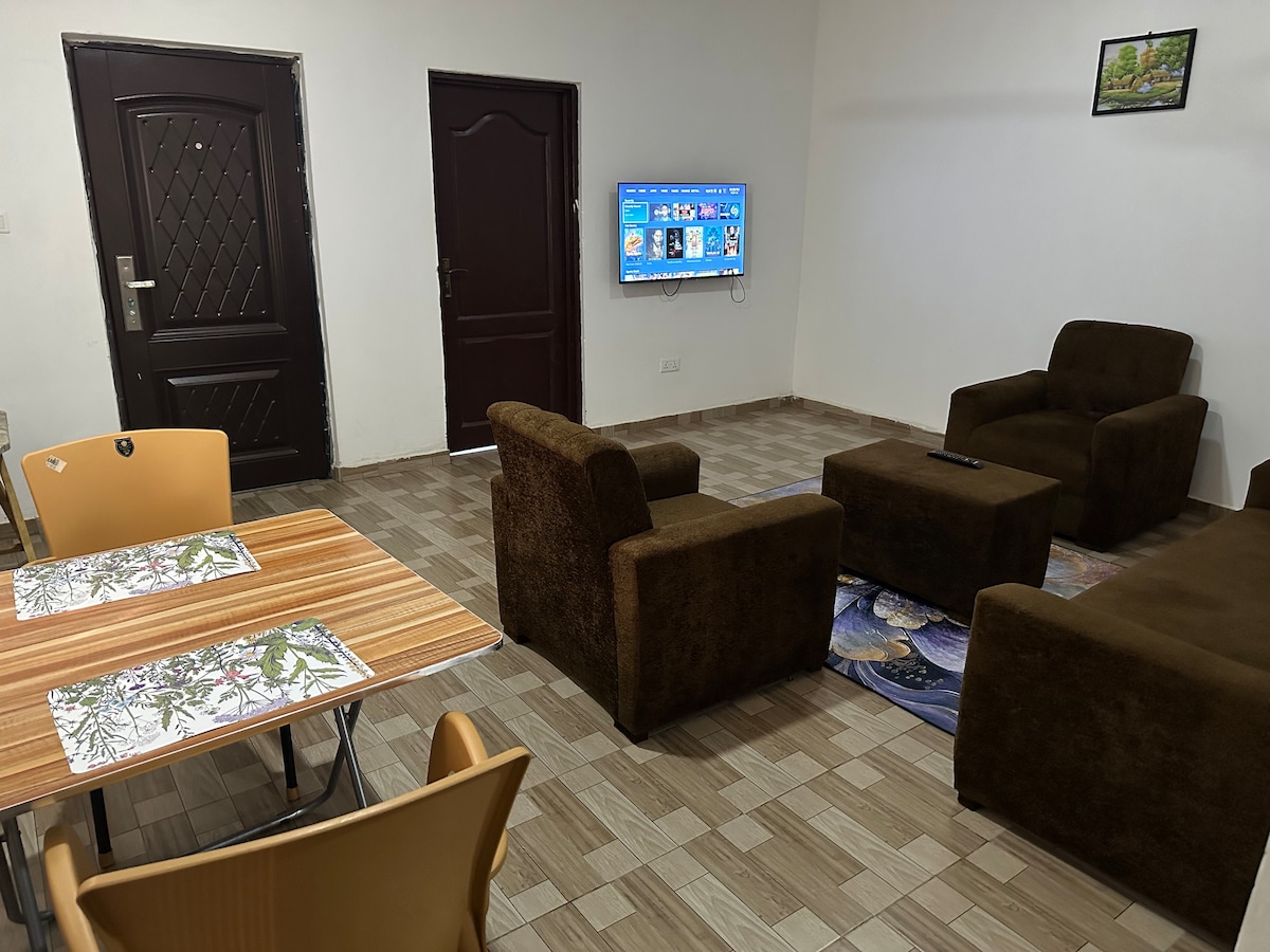 I BR公寓位於St. James Atimpoku,距離Royal Senchi Hotel and Resort 3分鐘車程。 寬敞,配有配有標準雙人牀的臥室、浴室、配有沙發的客廳、WIFI、本地和國際頻道的智慧電視、配備爐竈的廚房(非烤箱)、冰箱、烹飪用具、刀具套裝。 停電時可提供備用發電機
