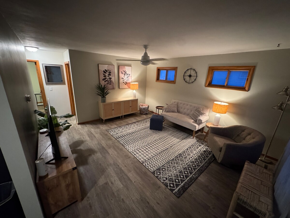 360號出口的I-80以北僅3英裏,距離紀念體育場或林肯動物園45分鐘。 位於大島( Grand Island )和林肯( Lincoln )之間。 使用密碼鎖從您自己的入口進入。 全新改造,完全獨立的主臥室,位於主樓層,配有大牀。 走廊對面的全功能浴室配有可愛的基座水槽和浴缸淋浴組合。 客廳家具齊全,提供電視和網路。 樓上是一間大型第二間臥室,配有2張雙人牀和小電視,可供觀看DVD。