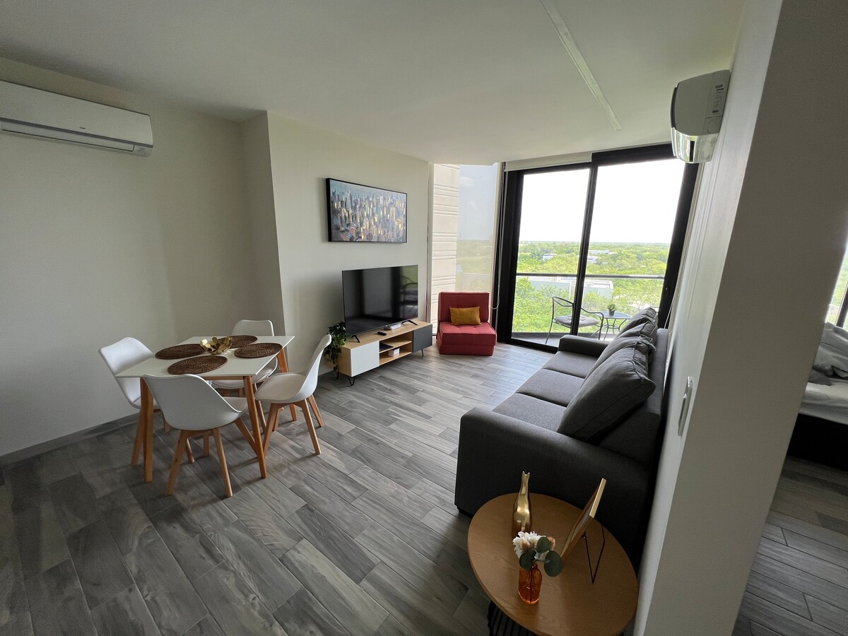 Modern studio with lake and tropical forest views in Mérida’s top residential area. Cozy and elegant, located in the north side of the city with a warm climate. Features a king bed (A/C), double sofa bed, equipped kitchen, and full bathroom with towels, hair dryer, and iron. Enjoy beautiful views and exclusive building amenities for a comfortable, memorable stay.