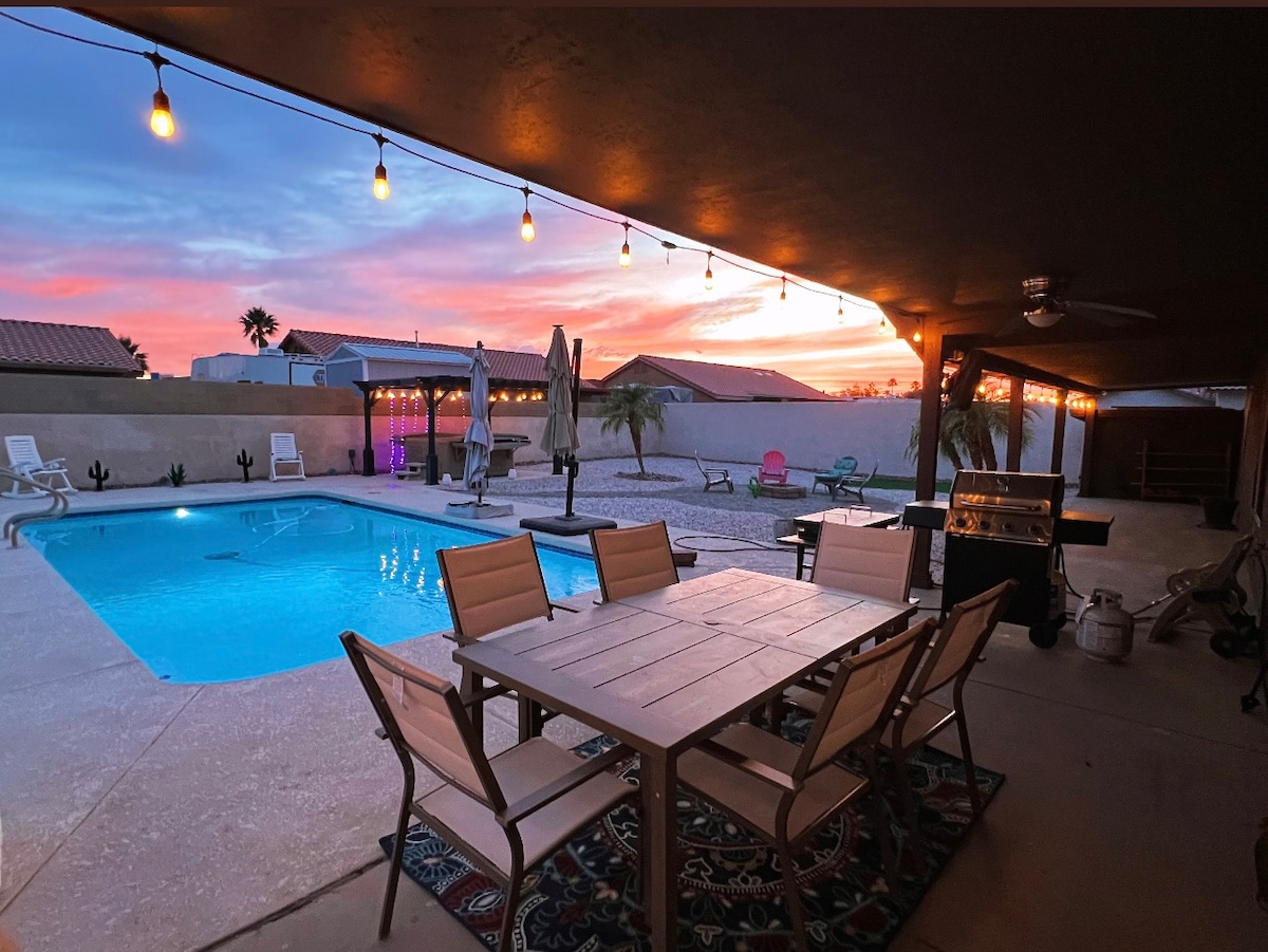 位於尤馬綠洲的中心,設有私人泳池、按摩浴缸和茂密的景觀! 這間寬敞的房源距離餐廳、商店、MCAS Yuma和YRMC僅幾分鐘路程。 享受度假村風格的後院,配有閃亮的泳池和水療池、有蓋露臺和兒童遊樂空間。 內部設有開放式起居空間、大型開放式廚房、高速WiFi和舒適的臥室以及第二間客廳。 非常適合家庭、雪鳥和團體度假,有充足的空間供您放鬆身心、重新建立連結,並一起創造難忘的回憶。