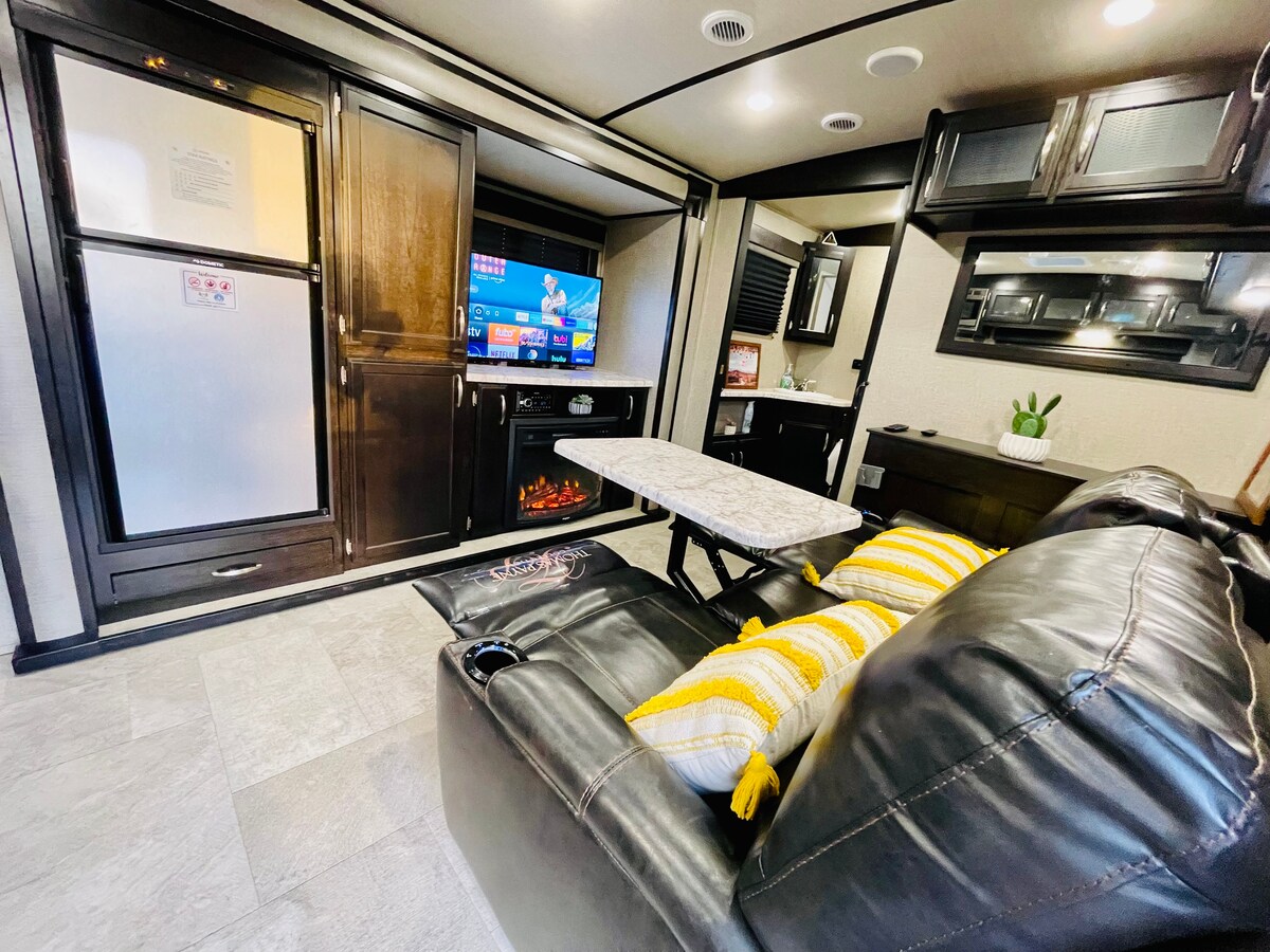 舒適,入住這輛2人的豪華露營車。 配有按摩劇院加熱座椅,壁爐前面就有旋轉桌子和智慧型電視。 寬敞的浴室。 獨立臥室配有豪華大牀墊,有自己的智慧電視和空調!