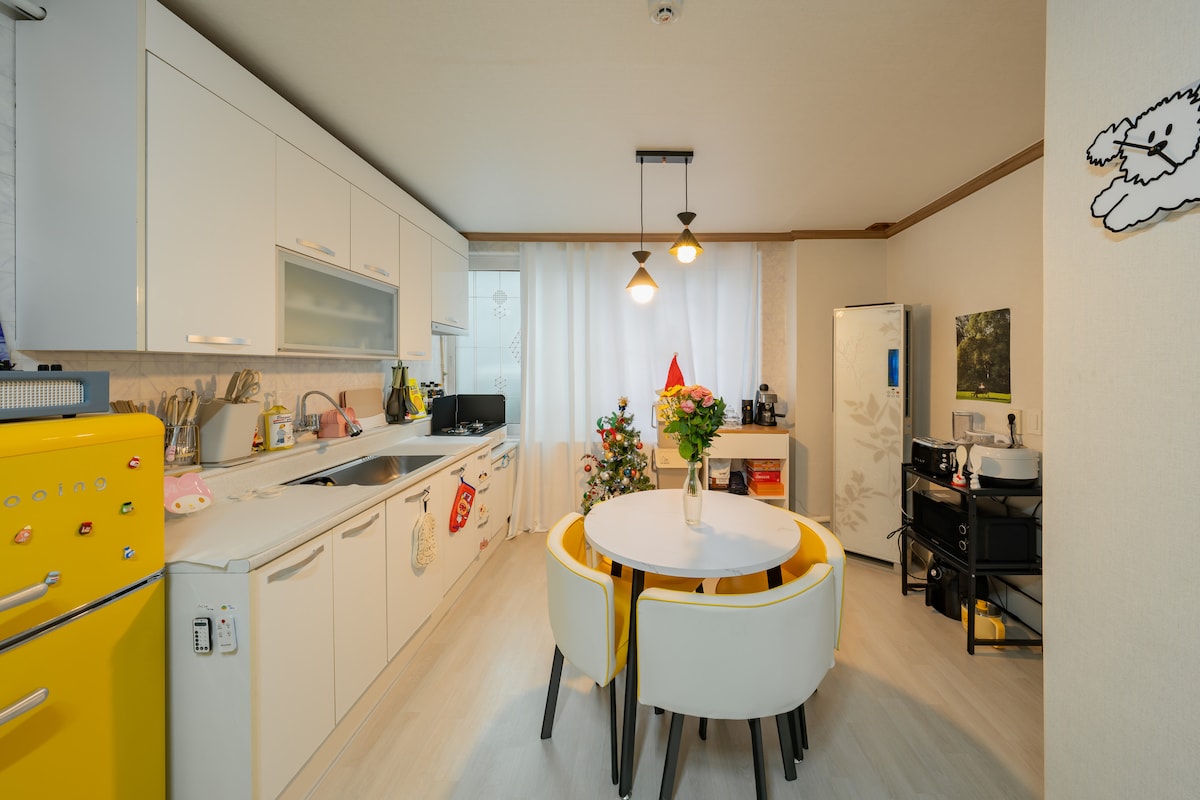 체크인 : 오후 4시 체크아웃 : 오전 11시(Late Checkout 가능합니다 시간당 2만원 말씀주세요) *방1개. 도어 X 아치형 벽문 O * ( 퀸 침대 2개. 토퍼 침구류 제공) * 부엌 1 * 파티.이벤트. 가능. 촬영가능(협의) * 흡연 금지 - youtube,OTT(넷플릭스), WIFI, 스마트 TV - 슬리퍼, 시계 - 냉장고, 에어컨, 바닥 난방 보일러 - 세탁기, 세제,유연제, 건조기 - 암막커튼 - 수저, 그릇, 케이크 트레이(대형) - 식탁 & 테이블 - 수건, 샤워가운 - 거실 에어컨, 방 에어컨 2in1 - 욕조 환풍기 최신형(온풍 가능) 애완동물 X #주차 1. 1 호실당 1대 무료 주차 입니다. 2. 2대이상 주차 시 말씀주세요. 일일 2,400원 공영주차장이 바로 앞에 있습니다. * 휴대전화 충전기 분실이 많아요 비치 했지만, 그래도 구비해오세요 * 물 2개 준비 해두었습니다. * 마트, 편의점 가까워요