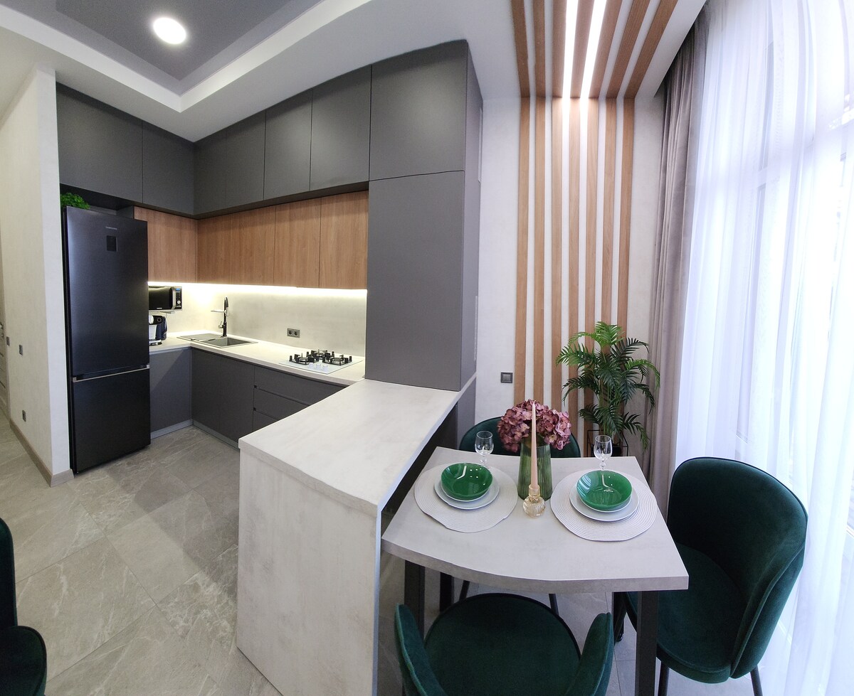,冬季櫻花( Winter Cherry )「是一套舒適時尚的公寓,位於新歐洲紐約市( New Europe )紐約市( zh/k )」。最多可供4人入住。 舒適的家具,現代化電器,精心設計的內部細節。一切都為您提供方便和舒適的生活。WI-FI、有線電視、白雪牀、蓬鬆的毛巾、個人衛生產品、餐具。公寓位於該地區,提供方便的四通八達的交通工具,靠近Tavria-B Trz、Epicenter大賣場、市場、餐廳、地區醫院和Polyclinic、Smartlab等。
