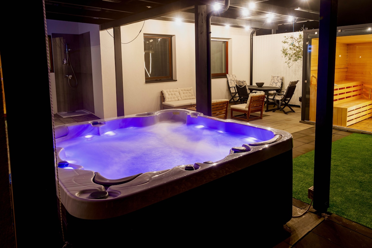 按摩浴缸度假屋,配備電動自行車和遠程氛圍