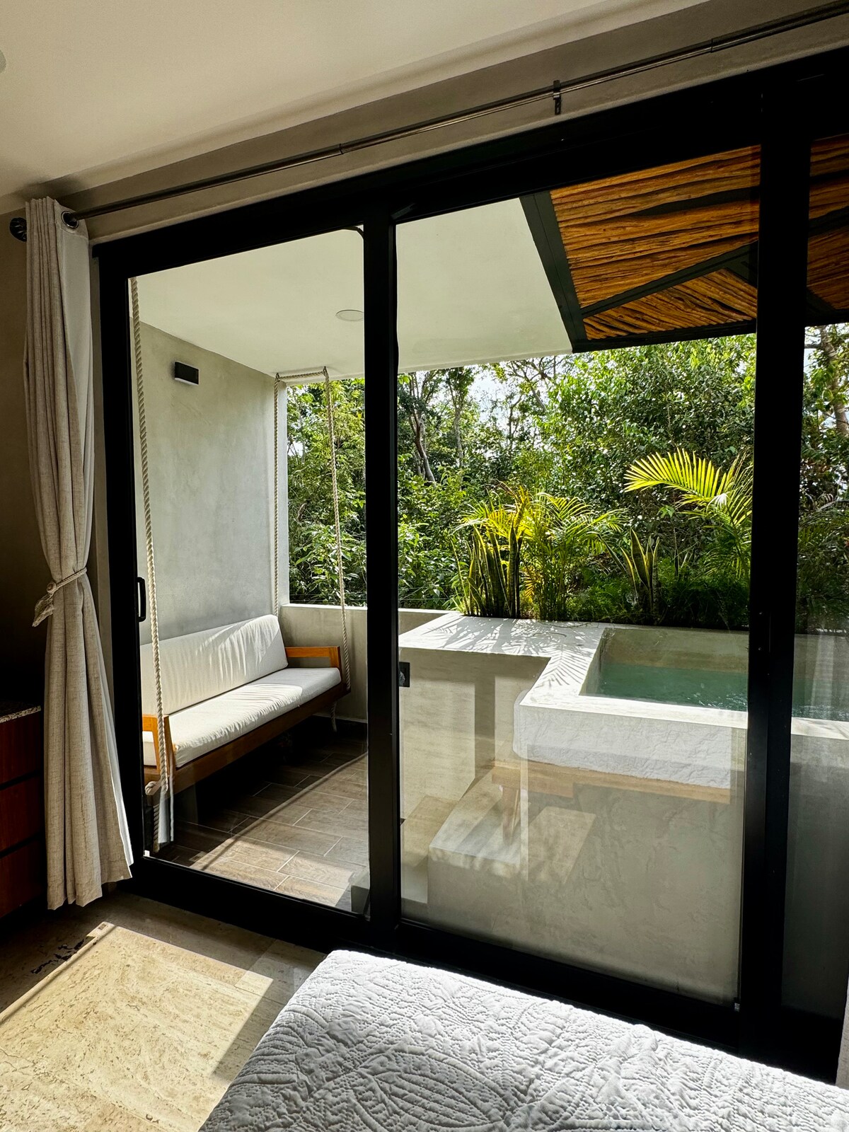 Feel right at home and enjoy all the comforts you expect. This apartment features one bedroom with a bathroom, a fully equipped kitchen, a living room that opens onto a balcony with a private jacuzzi surrounded by lush greenery. Located in a new building with only six units, it also offers a lounge area, terrace, pergola, and shared pool. Just steps away from a lively neighborhood full of great dining options . FREE BIKES to explore Tulum