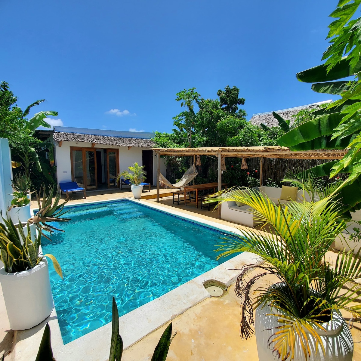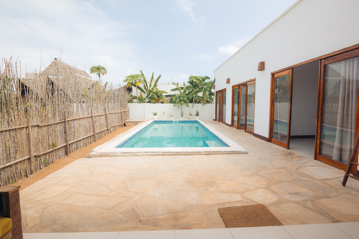 整套別墅位於靠近海灘,步行不到一分鐘即可抵達。 室內乾淨、通風,並以斯瓦希里風格裝飾。 有游泳池、休息室和五間帶浴室的私人雙人房,還可以為您提供兩間舒適的起居室,適合朋友、家人和蜜月旅行者。 樓下設備齊全的廚房。別墅附近有一些餐廳、商店和迷你市場。 我們熱衷於讓您度過難忘的假期。