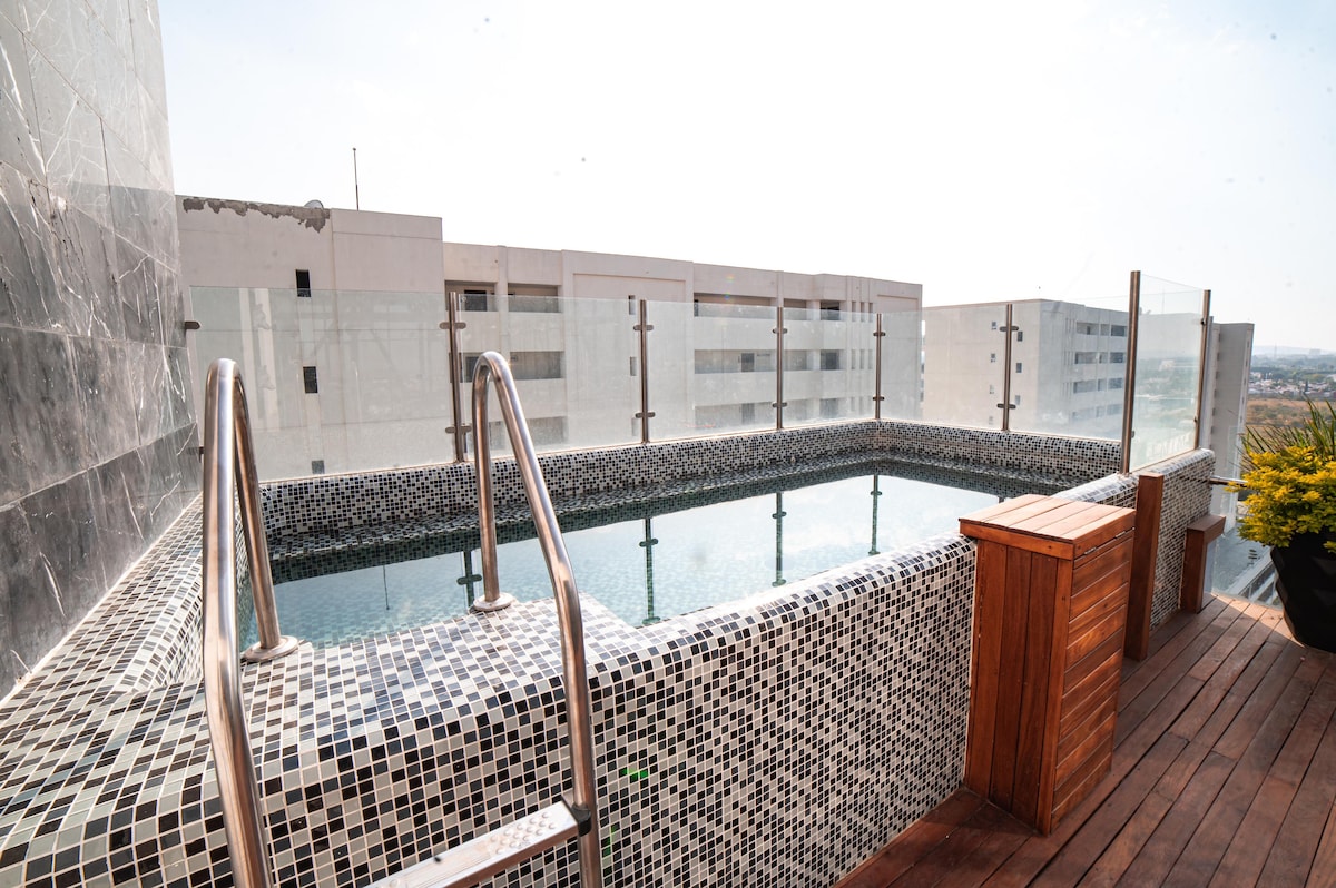 這間位於瓜達拉哈拉的單臥室公寓是情侶來這裡享受時光的完美地方。公寓擁有全景景觀和大陽臺,您將擁有整個城市作為背景,公寓還有溫水泳池,即使下雨,您也可以盡情享受。這裡有一個開放式起居區域,因此您可以在這裡享受充足的空間,並提供免費停車位,讓您可以抵達並享受公寓,無需任何壓力。