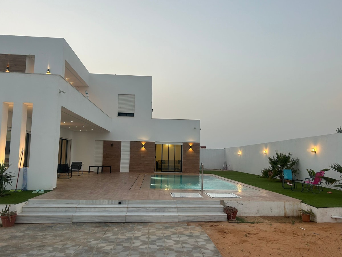 這間迷人的海灘別墅坐落在Zarzis ,靠近飯店、餐廳和海灘,提供寧靜的度假勝地。 它以地中海為靈感,配有白色牆壁和蔚藍的裝飾,設有舒適的起居區域、設備齊全的廚房,以及配有舒適牀鋪和套房浴室的臥室。 傳統的突尼西亞門通往屋頂露臺,可欣賞全景,非常適合用餐或休閒。 外面有一個私人泳池,四周環繞著日光浴躺椅,完善了寧靜的度假勝地。