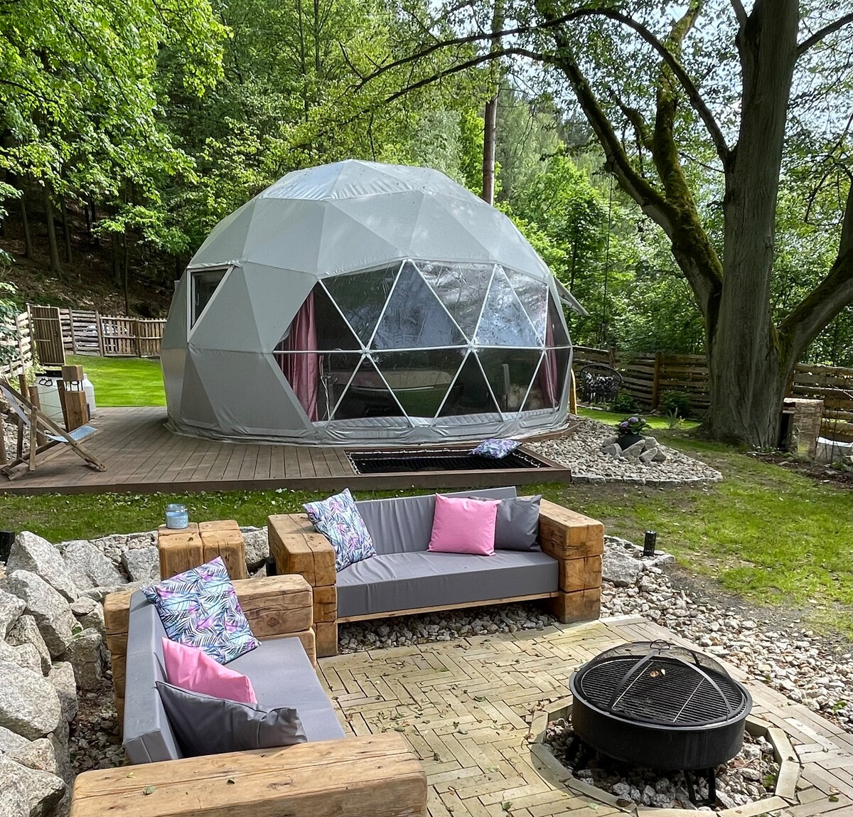 ForRest Glamp MiMo提供大自然中的奢華隱居。 時尚的室內配有廚房、冷氣和森林景觀浴缸,確保舒適。 在外面,您可以享受熱水浴缸、帶燒烤架的火坑、大型鞦韆和吊床。 在砂岩酒窖或波西米亞涼亭,配有Green Egg燒烤架,難忘時刻等著您。 非常適合享受和平、浪漫和難忘的豪華露營。